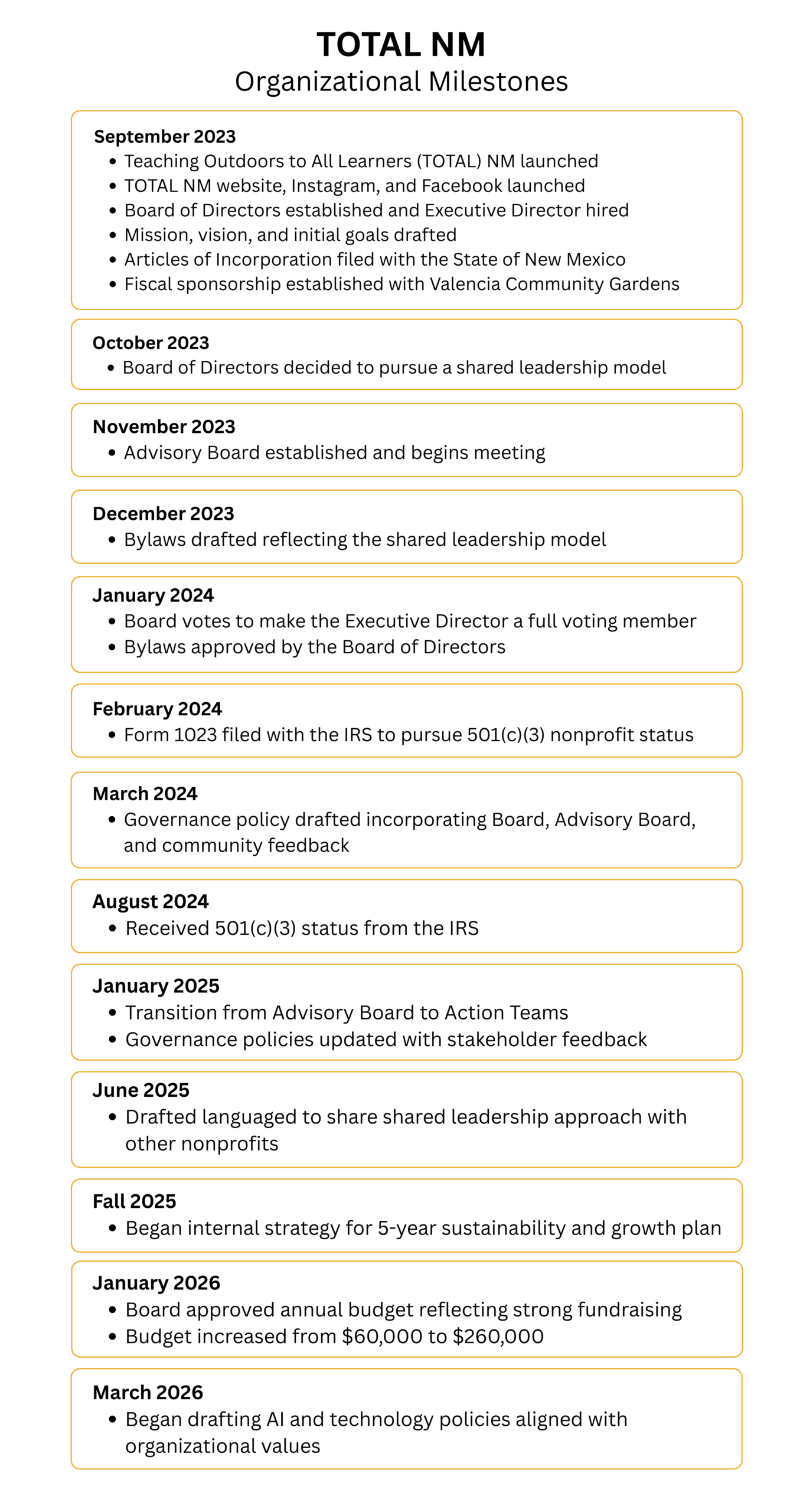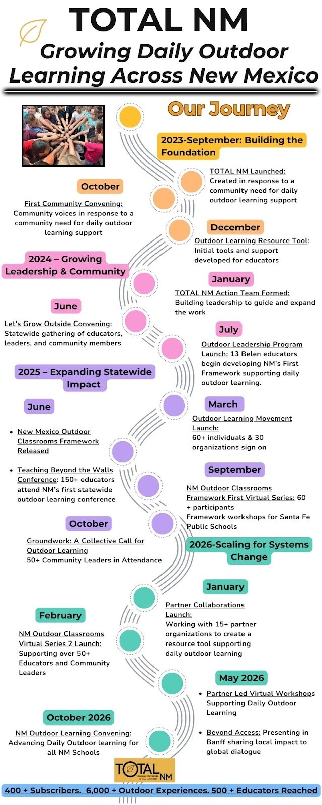 What began in 2023 as a vision for equitable outdoor learning has quickly grown into a collaborative, statewide effort. This timeline shares the milestones, decisions, and momentum that continue to shape TOTAL NM’s work in supporting educators, students, and communities across New Mexico.